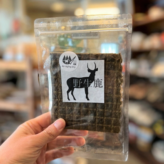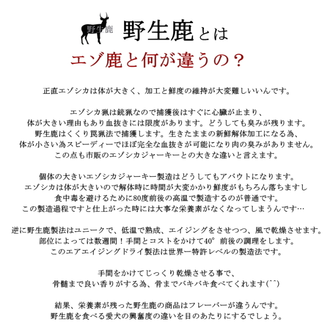 その製法がユニークで、低温で熟成、エイジングをさせつつ、風で乾燥させます。部位によって期間は異なりますが、数日から数週間かけて40°前後の調理をします。エゾシカ、通常の製造工場では無理なんです。手間をかけてじっくり乾燥させる事で、骨髄まで良い香りがする為、骨までバキバキ食べてくれます(^^)プラントでは木工製作所から出るおがくずや木片を熱源としているので山の恵みであるシカを地球環境にも配慮した調理をしています。とにかく栄養素が残った野生鹿の商品はフレーバーが違うんです。犬の興奮度がまったく違うので驚きます。エゾと野生鹿を並べるとエゾを食べなくなりますよ。