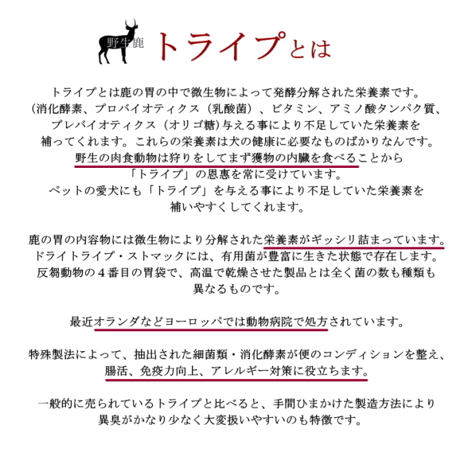 犬は本来肉食動物です。進化を遂げてきてはいるものの消化機能の特徴、構造などは肉食動物です。犬が本来必要としている食べ物をしっかり与える事でしかっかり栄養が摂れ、腸を健康にし、免疫力を高めていく事ができます。こちらのガムは丹波産の野生鹿を100%使用しています。もちろん完全無添加です。新風乾製法で乾燥させる鹿肉は、48度未満の低温で乾燥するため、必須脂肪酸であるα-リノレン酸や高品質なタンパク質、その他有用ミネラルが壊れずに残っています。